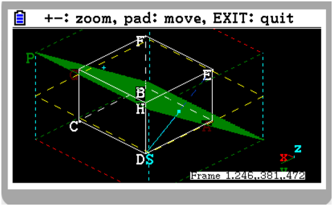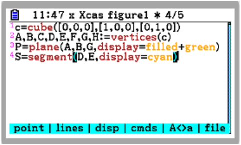 c:=cube([0,0,0],[1,0,0],[0,1,0]); A,B,C,D,E,F,G,H:=vertices(c); P:=plane(A,B,G,display=filled+green); S:=segment(D,E,display=cyan);