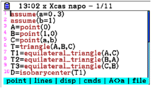 Abstract: We introduce an interactive geometry appliction for the Casio FXCG50, Numworks N0110 and TI Nspire CX/CX II that features euclidean and analytic geometry in the plane and space. It is also possible to prove some geometry theorems using the computer algebra system and to include user-defined CAS functions in geometric constructions.
