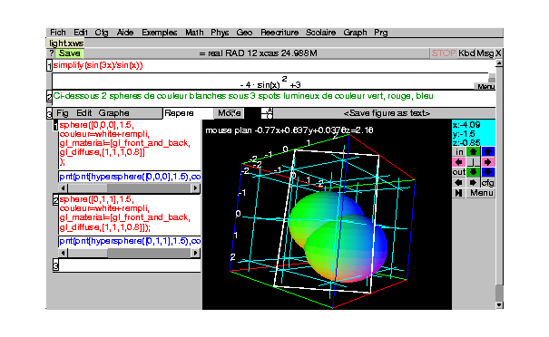 3-d geometry and graphs: point, segment, line, plan, triangle, polygons, circles, conics, parametric curves, surfaces, intersection, tangents... Dynamic geometry. All geometric instructions are programmable |