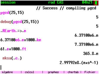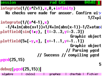 Aujourd’hui à l’automne 2024, après plusieurs mois de travail, KhiCAS pour ti83 (et 84) est une réalité, et s’ajoute aux innombrabres programmes développés pour cette calculatrice très populaire dans le monde (en particulier aux Etats-Unis). Il y a quand même un tribut à payer : la 83 est significativement plus lente que d’autres calculatrices sur lesquelles j’ai porté Xcas. Au point que TI a du rajouter un circuit spécial pour calculer les empreintes sha256 servant à valider l’OS ou les applications TI (un programme C calculant une empreinte sha256 sur le processeur de la 83 progresse à la vitesse approximative de 2000 octets par seconde, il faudrait plusieurs minutes pour valider l’OS et une vingtaine de minutes pour valider KhiCAS). Il faut donc souvent attendre plusieurs secondes pour avoir le résultat d’un calcul, et j’ai du enlever certaines fonctionnalités pour tenir dans l’espace disponible en flash pour me concentrer sur l’essentiel. Cela devrait toutefois largement suffire pour un lycéen, et fournir un environnement d’exécution plus stable pour CAS que chez un constructeur concurrent.