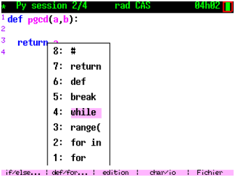 - une ligne d’état simple, qui affiche l’heure (bien utile en examen lorsque les smartphones sont interdits), le mode insertion par défaut comme sur tous les environnements informatiques contemporains, la touche suppr qui efface vers la gauche, et le mode alphabétique qui est par défaut en minuscules